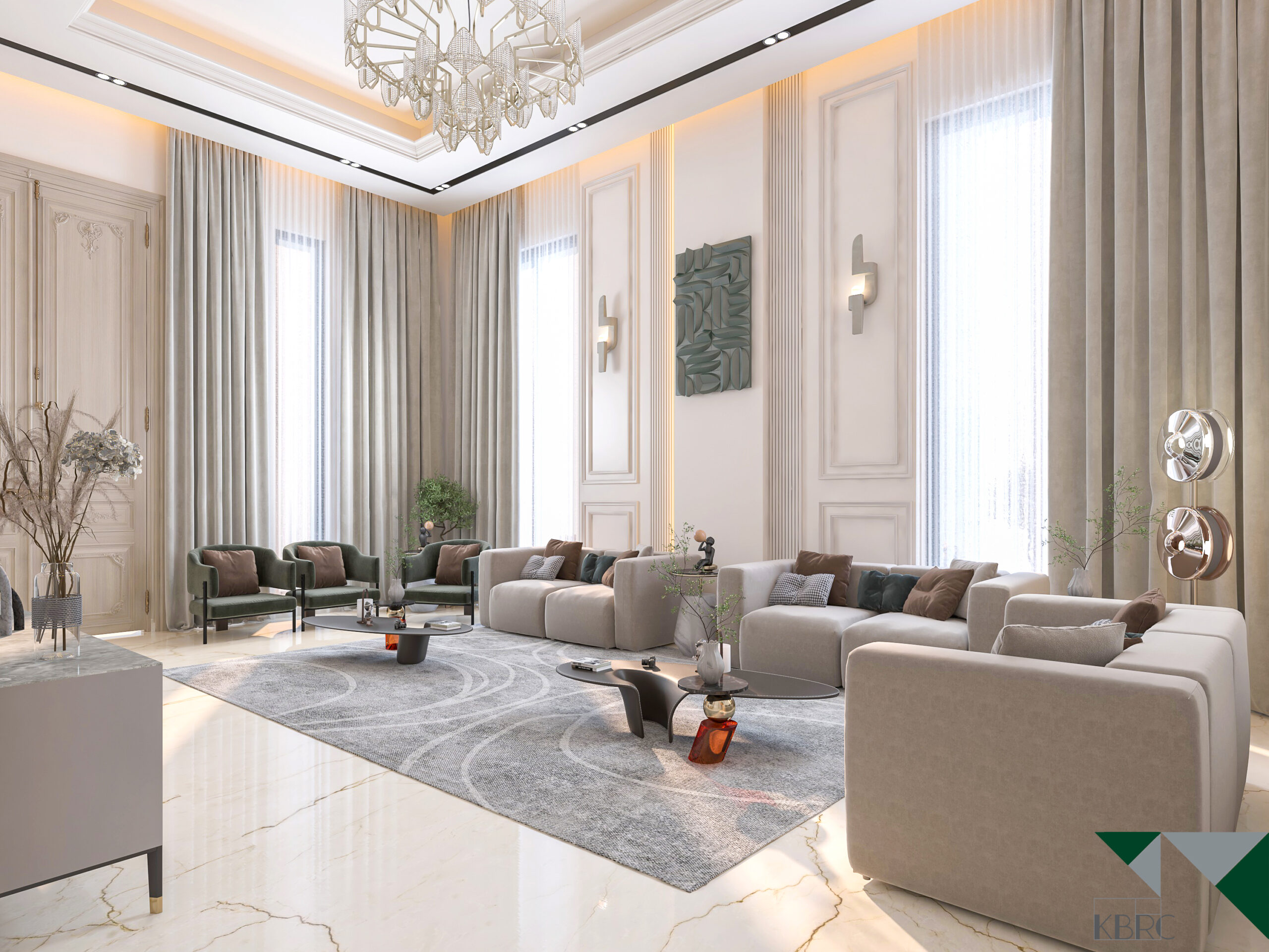 This living space reflects a perfect blend of luxury and comfort with its fluid and sleek design. Soft tones and modern furniture create a warm and inviting atmosphere, while carefully chosen textures add depth and refinement. Large windows allow natural light to flood the room, enhancing its serene and open vibe.