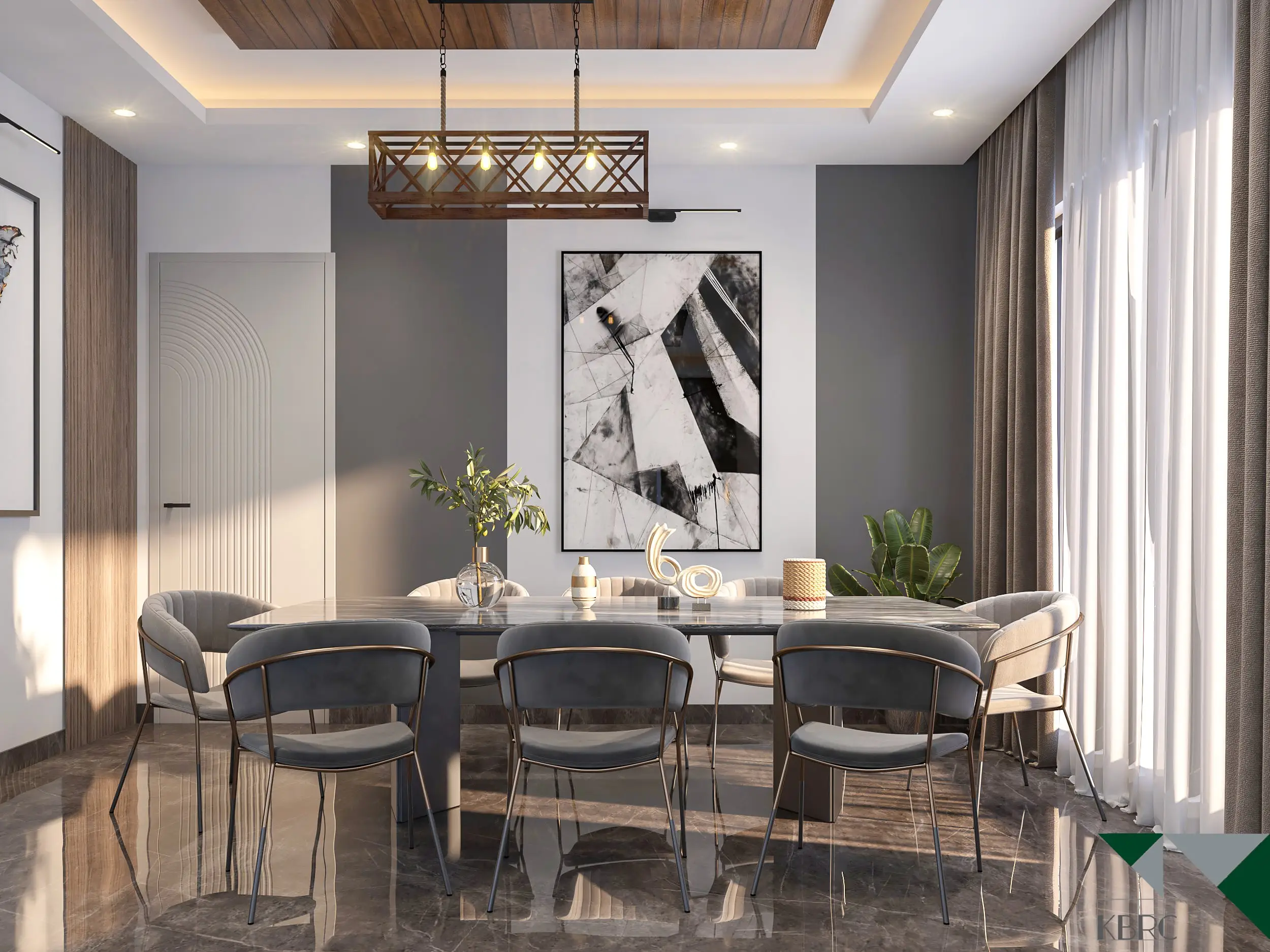 This dining space blends luxury and serenity, creating a warm, inviting, and sophisticated atmosphere. The natural light streaming through the large windows beautifully enhances the earthy tones, adding depth and vibrancy to the space.