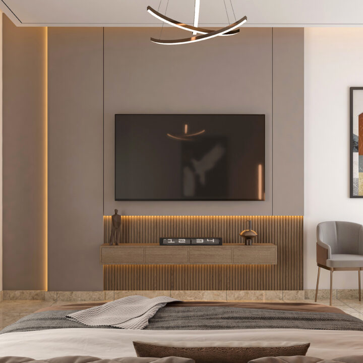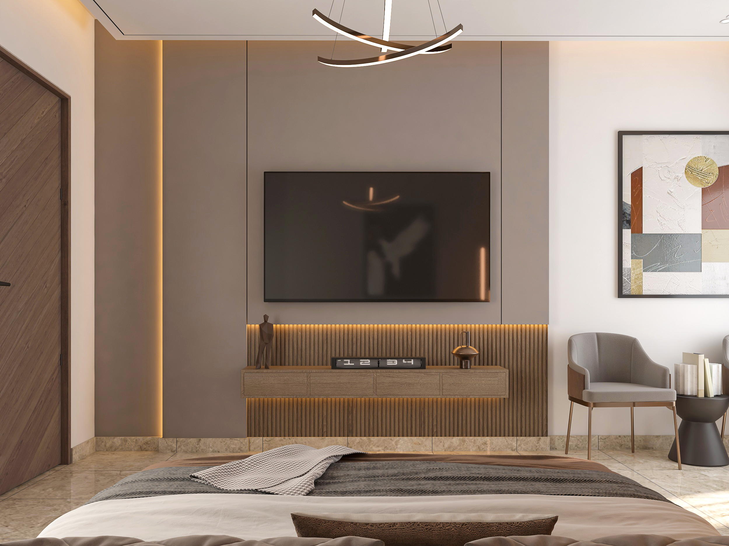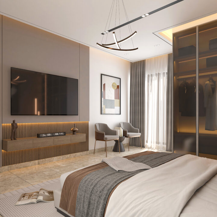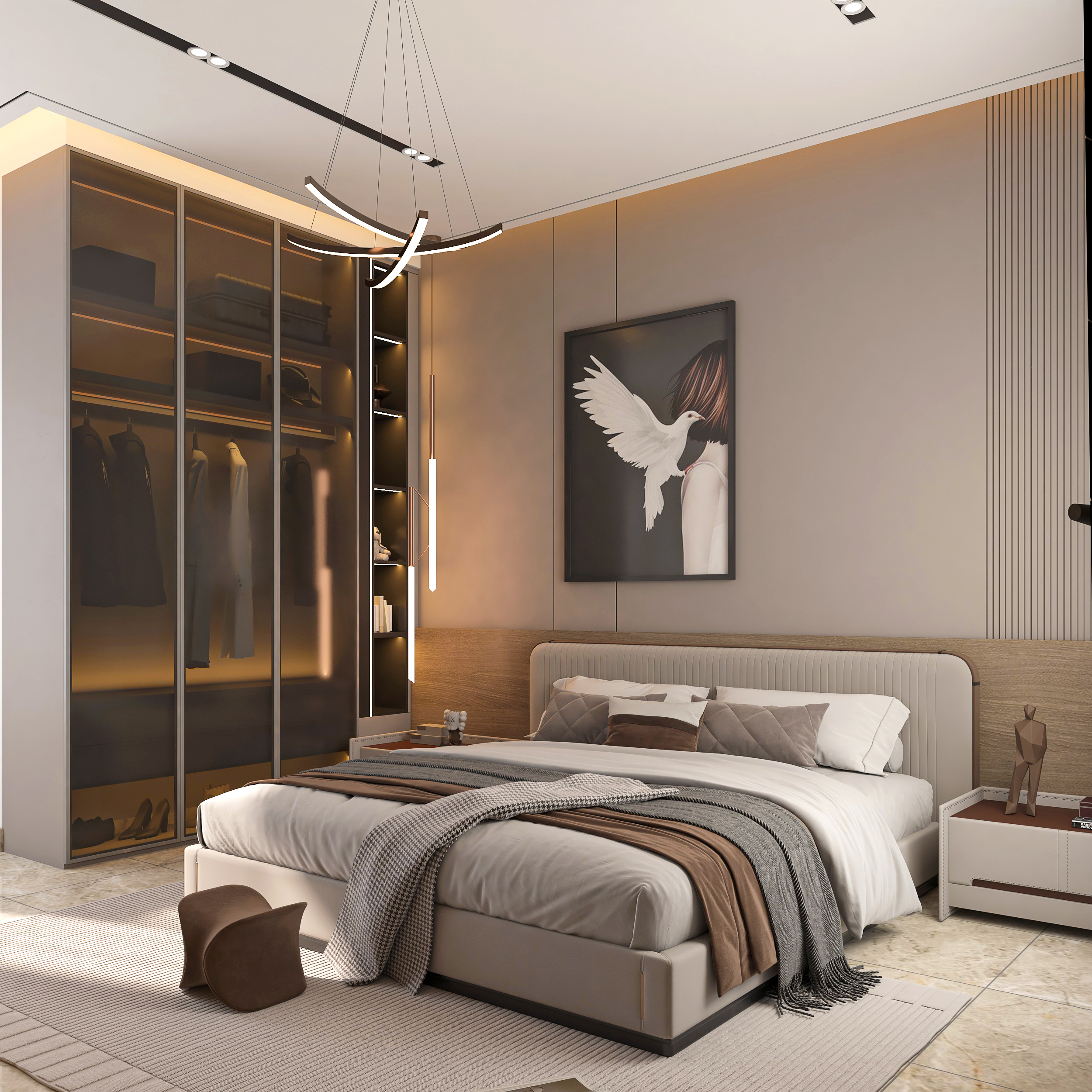 This space embodies the essence of modern minimalism, with clean lines, a muted color palette, and a focus on functionality. The design creates a serene atmosphere, combining comfort with simplicity for a peaceful retreat.