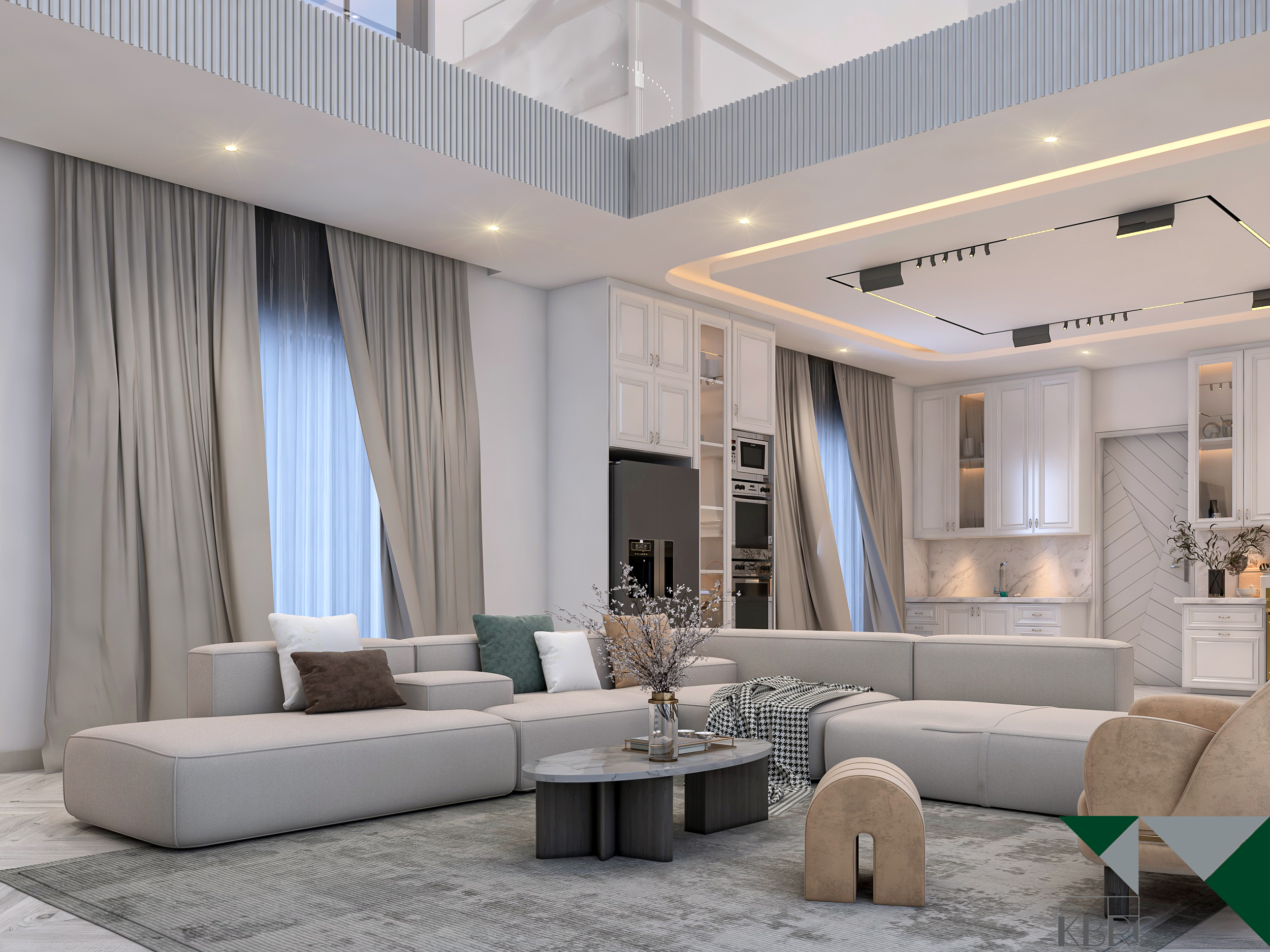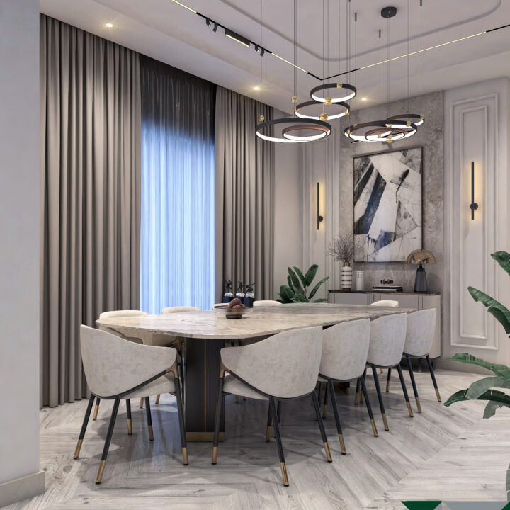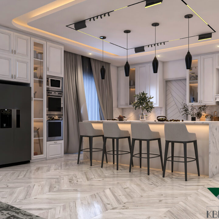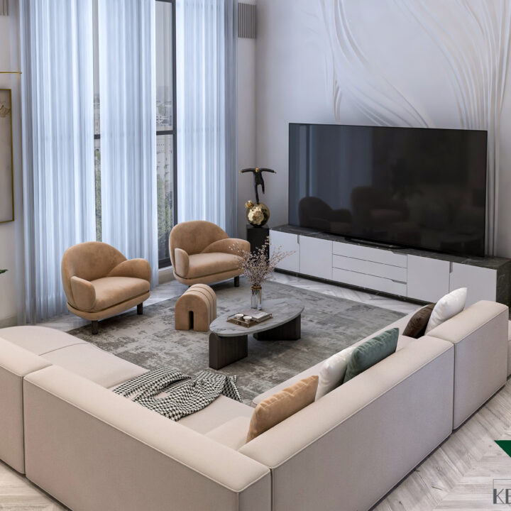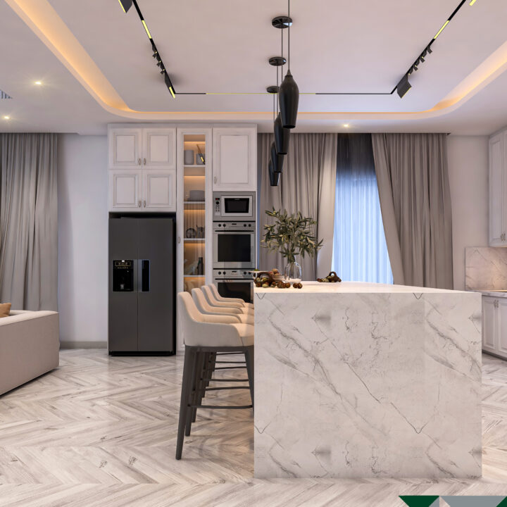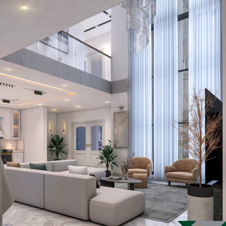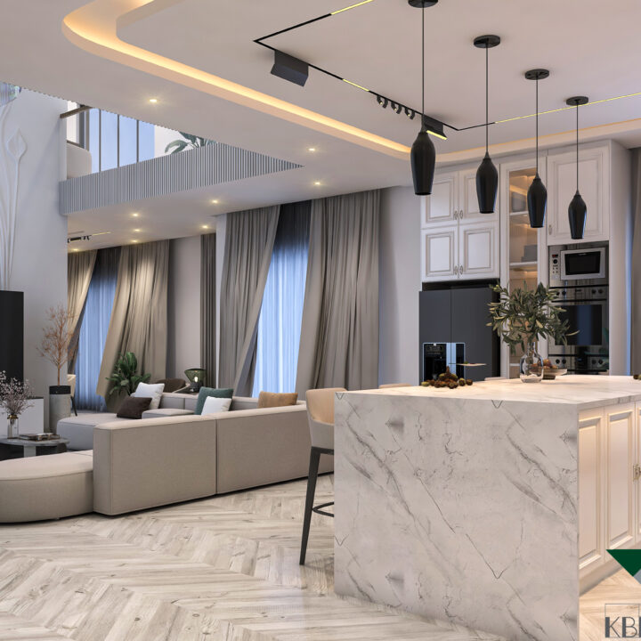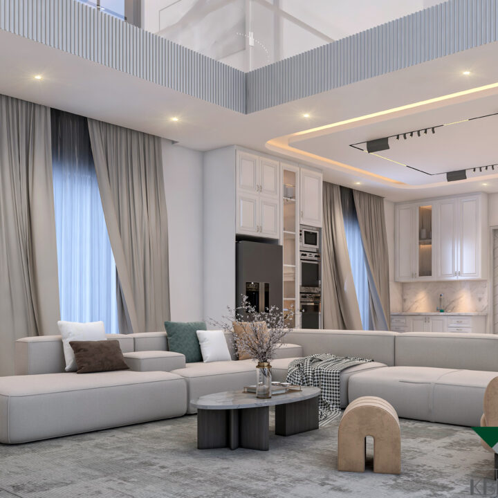 This interior design project celebrates open-plan living, emphasizing spaciousness and a seamless flow between areas. The design maximizes natural light, with floor-to-ceiling windows and soft neutral tones creating a bright and welcoming ambiance. Modern furniture, elegant lighting fixtures, and minimalistic details come together to form a sophisticated space that feels airy, functional, and luxurious. Subtle textures and carefully curated accents add depth without clutter, while the open layout fosters connection and comfort. The result is a refined modern home that balances style, practicality, and effortless elegance.