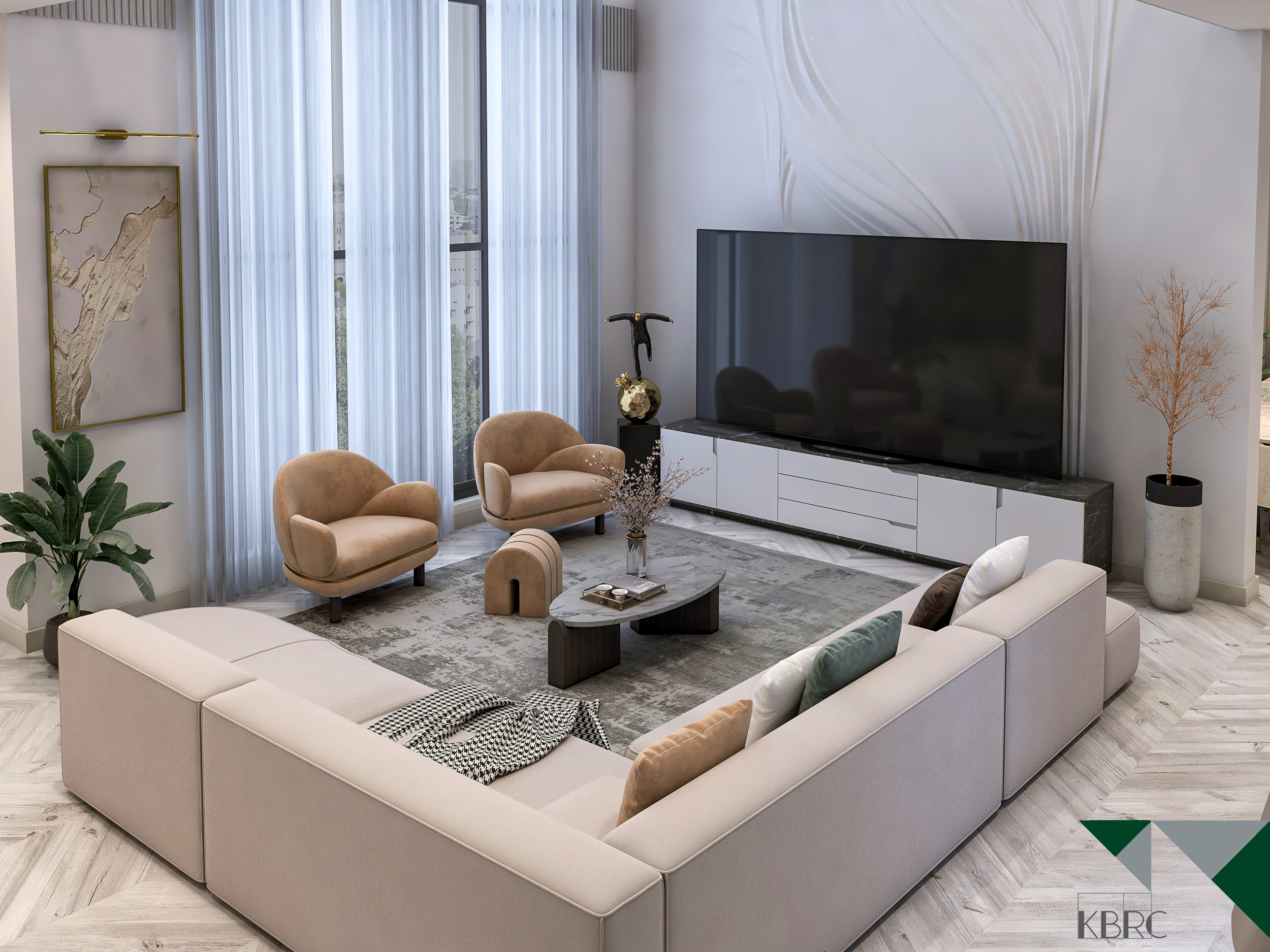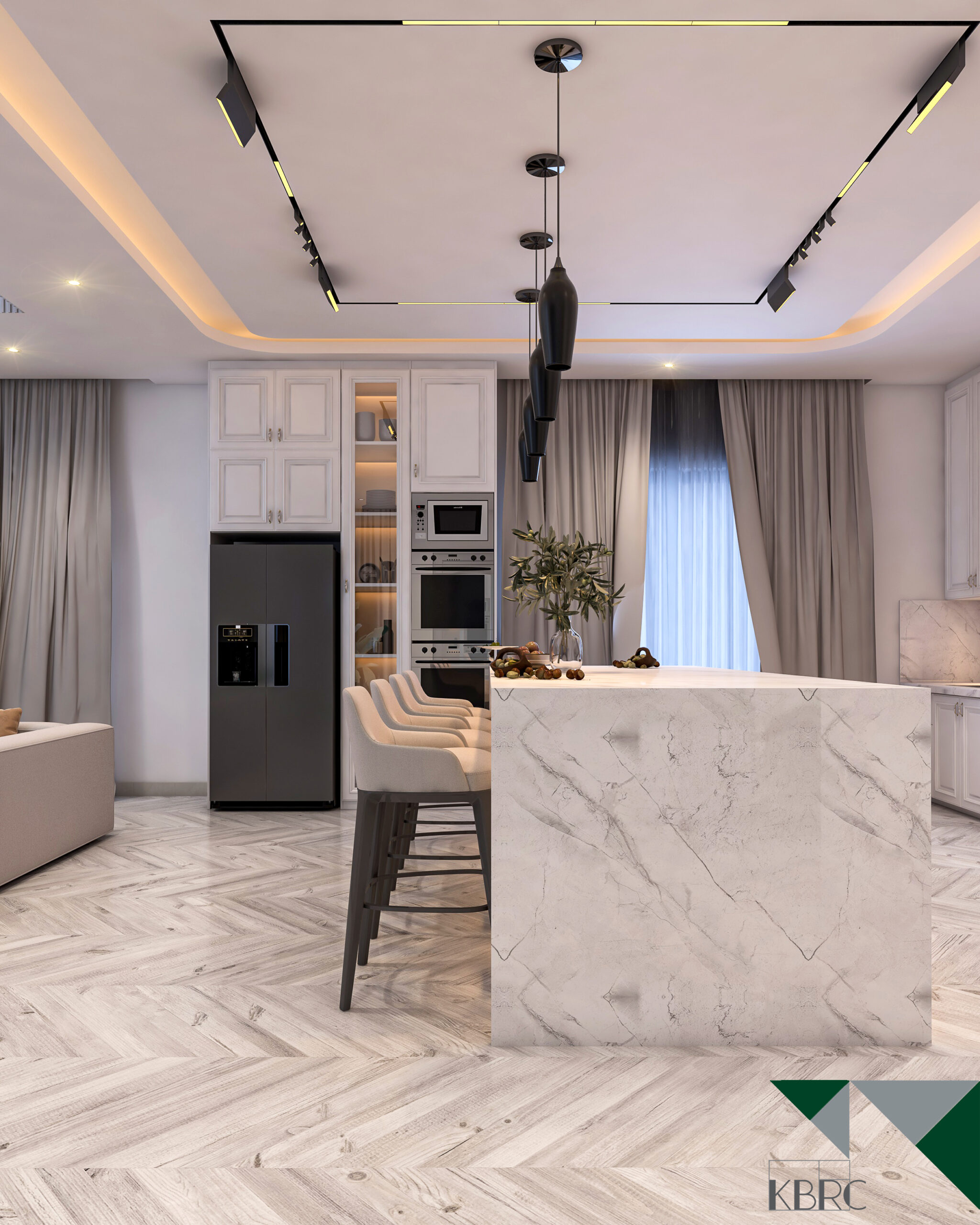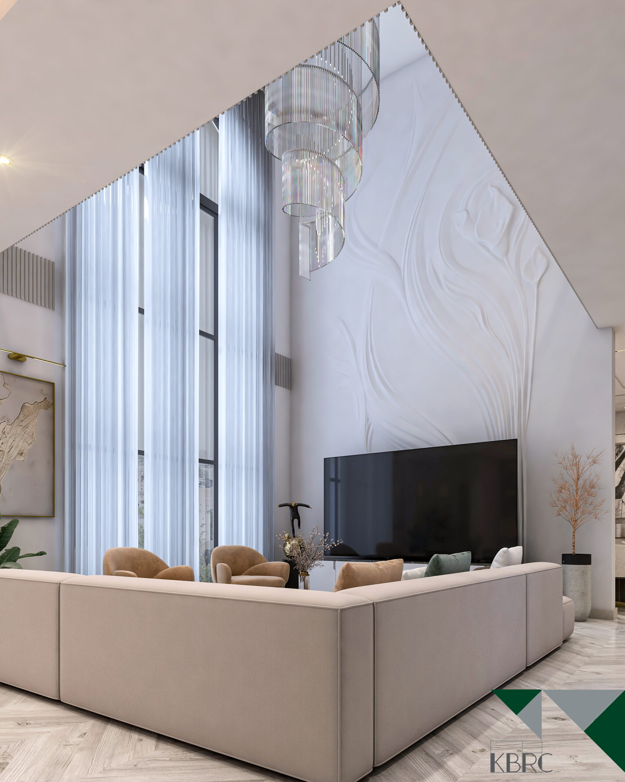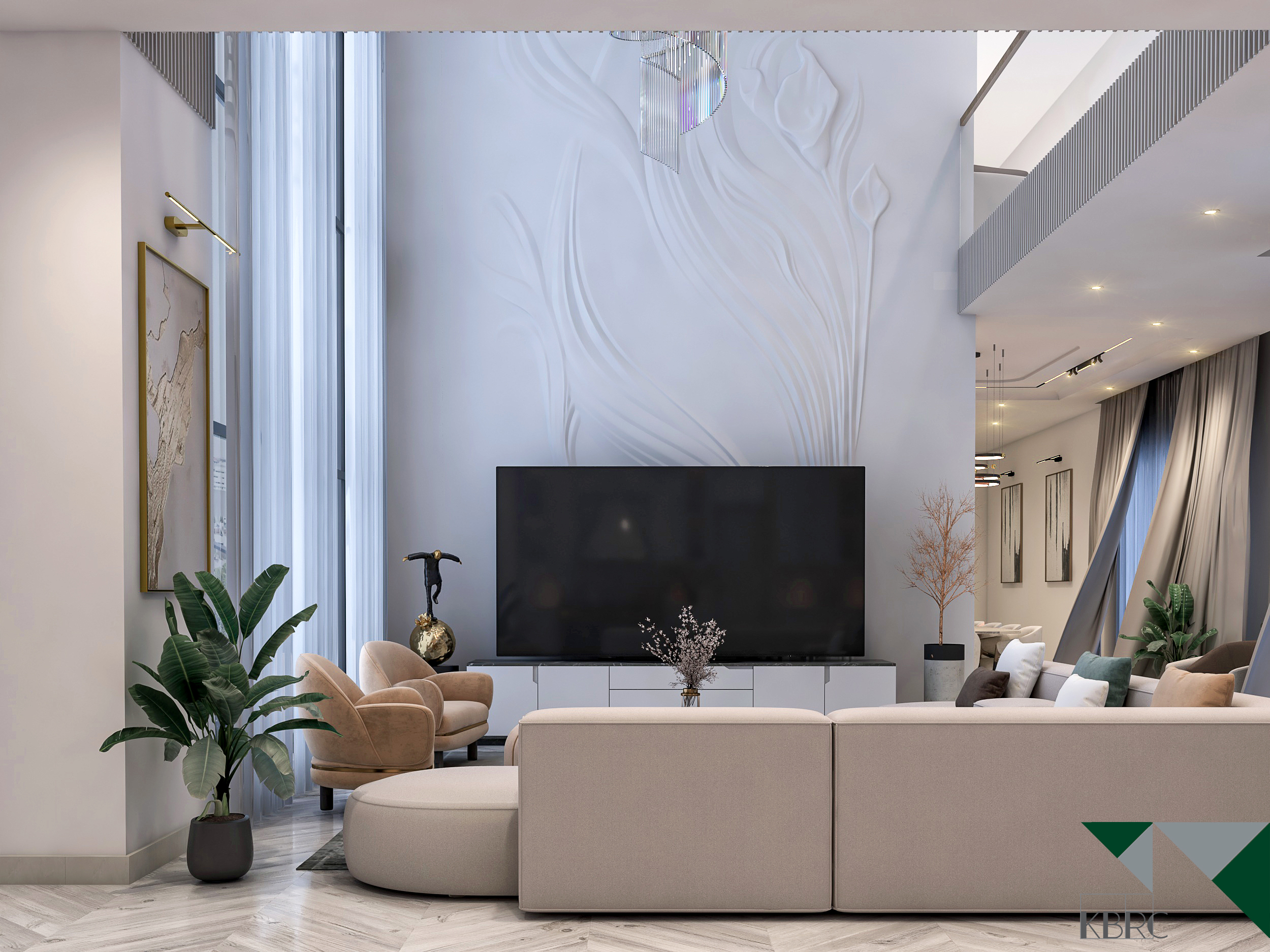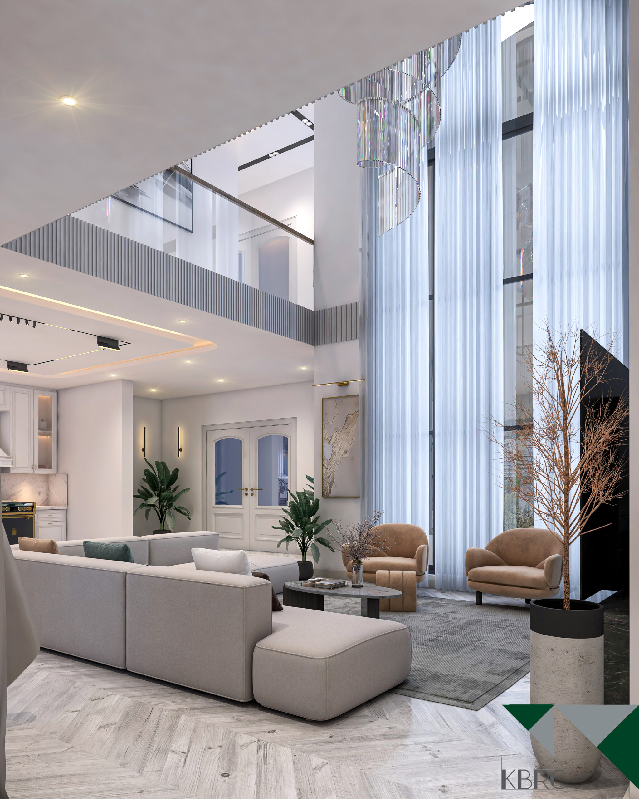 This interior design project celebrates open-plan living, emphasizing spaciousness and a seamless flow between areas. The design maximizes natural light, with floor-to-ceiling windows and soft neutral tones creating a bright and welcoming ambiance. Modern furniture, elegant lighting fixtures, and minimalistic details come together to form a sophisticated space that feels airy, functional, and luxurious. Subtle textures and carefully curated accents add depth without clutter, while the open layout fosters connection and comfort. The result is a refined modern home that balances style, practicality, and effortless elegance.