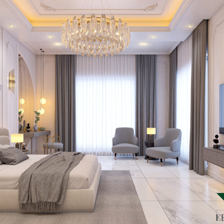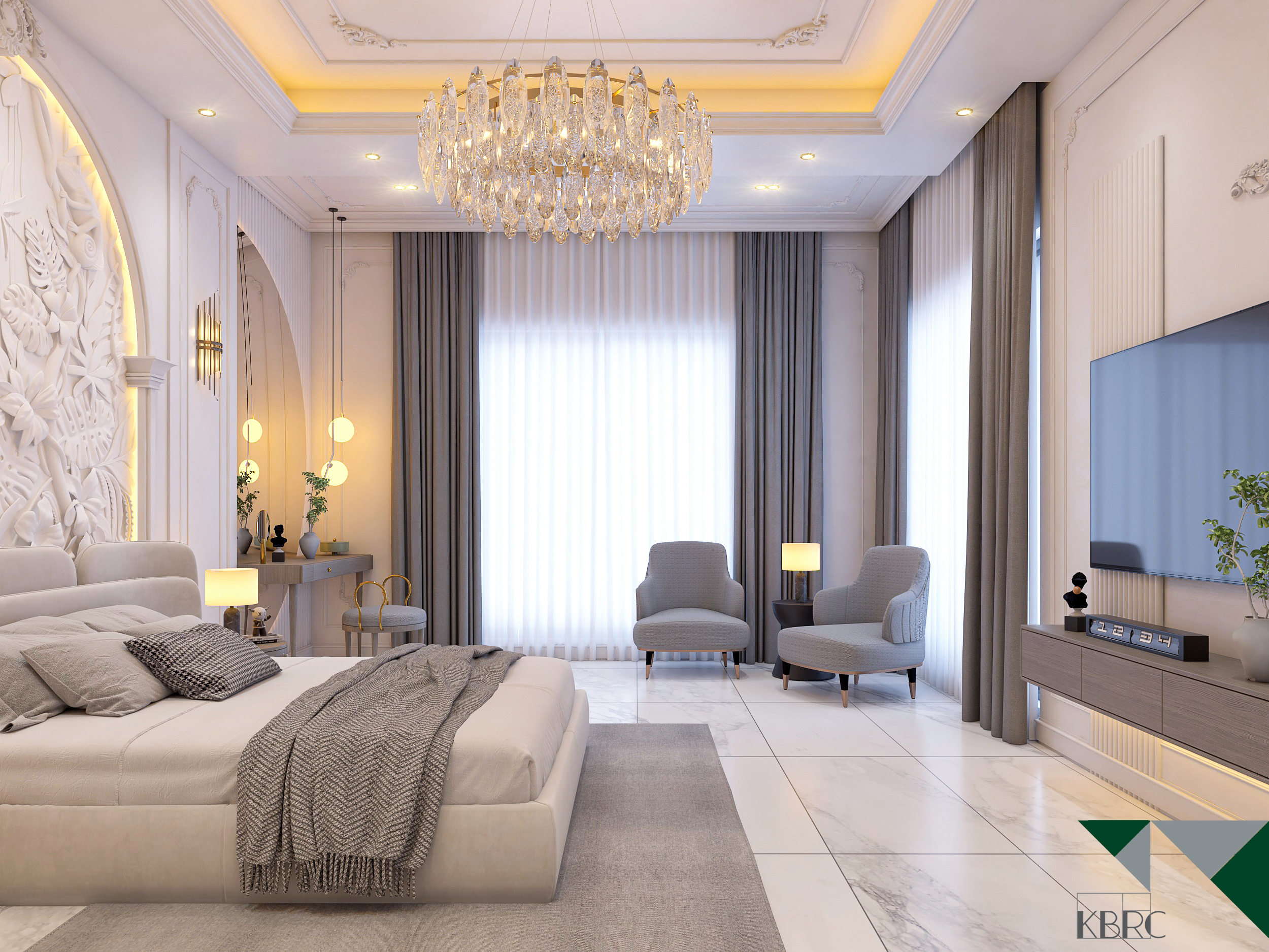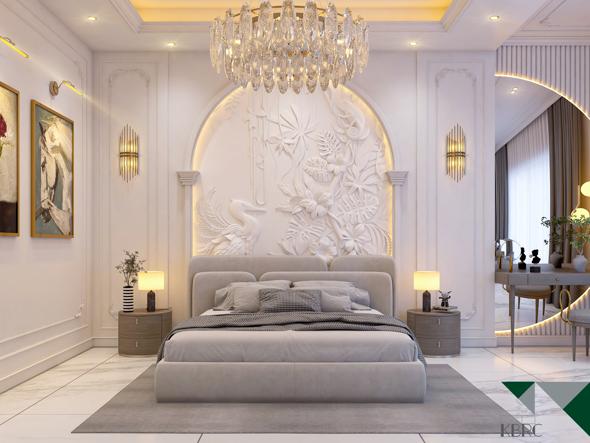 This bedroom interior brings a timeless touch of classical elegance with a modern twist. The soft neutral palette creates a serene environment, while intricate wall details and luxurious textures elevate the space. Elegant lighting fixtures and high-end finishes add a sense of grandeur, making it a perfect retreat that blends comfort with sophistication. Subtle decorative accents and carefully chosen furnishings enhance the refined atmosphere, while the balance of modern functionality and classical charm ensures both beauty and practicality. The result is a restful sanctuary that feels graceful, inviting, and effortlessly luxurious.